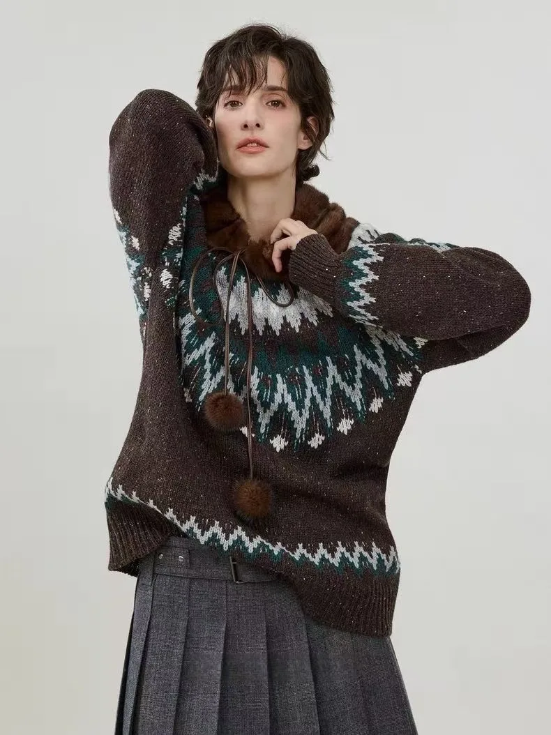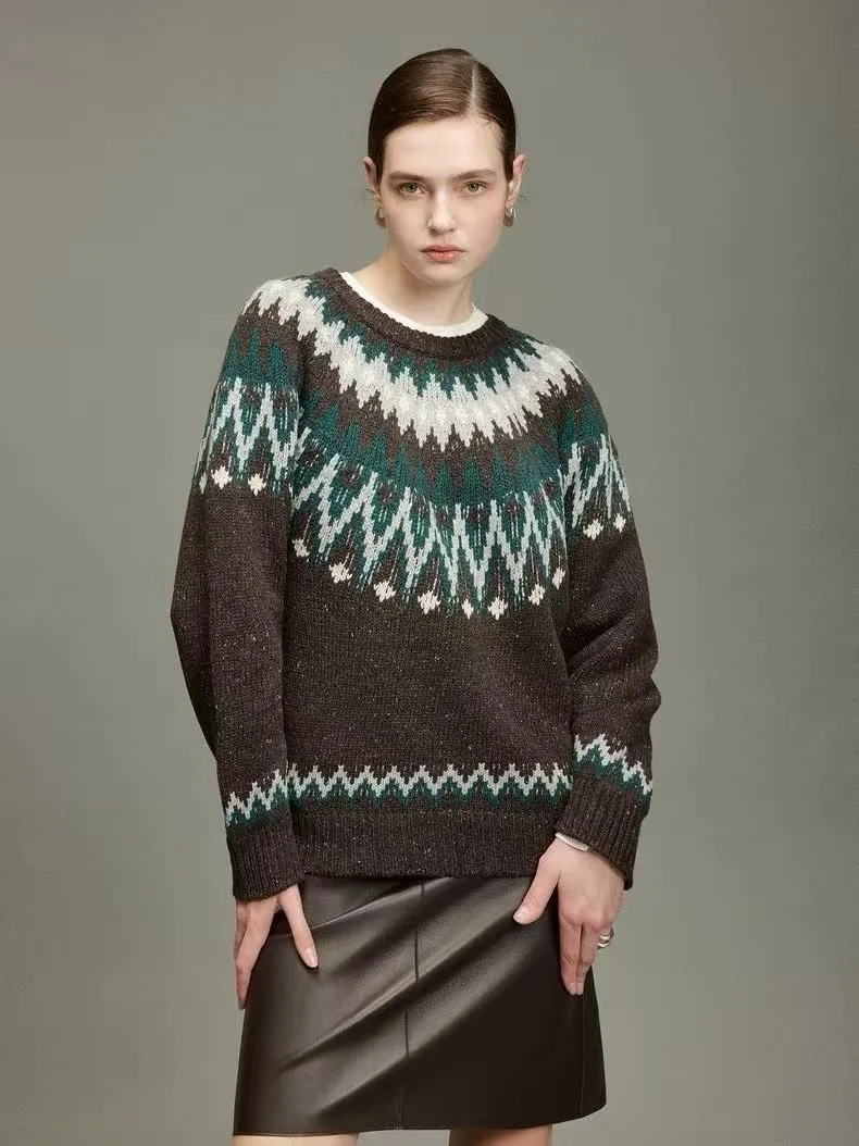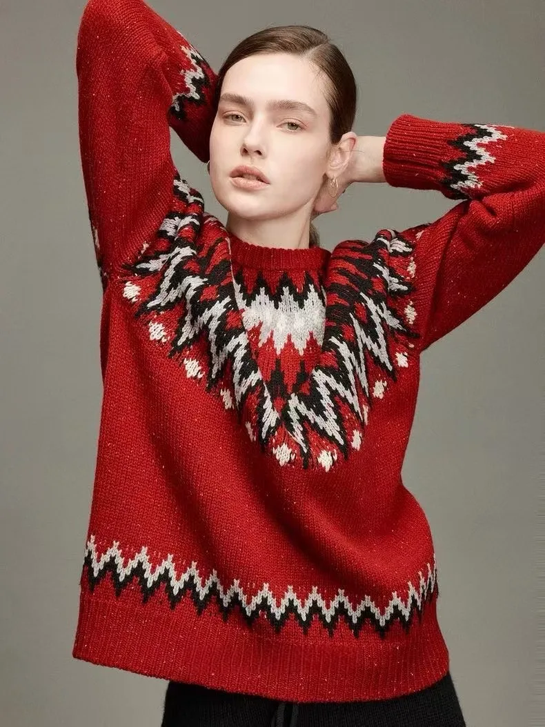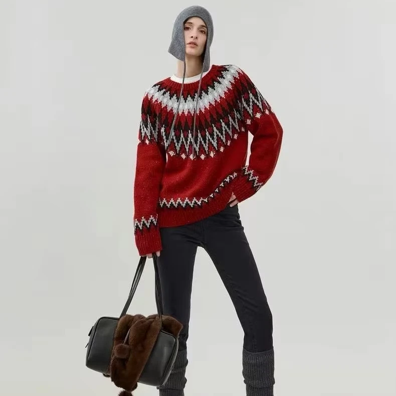 2026 Autumn Winter Wool Knitted Crewneck Pullover Korean Casual Lazy Style Fair Island Christmas Shirt Jacquard Atmosphere